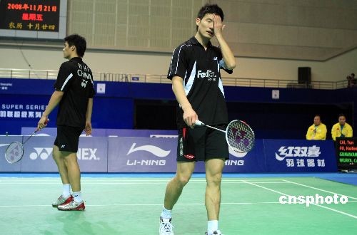 11月21日,在上海進(jìn)行的2008年中國羽毛球公開賽男雙1/4決賽中,中國頭號男雙組合蔡赟/傅海峰以1比2不敵跨國組合陳甲亮/吳俊明無緣四強(qiáng),三局的比分為17比21、21比19和21比18。中新社發(fā) 湯彥俊 攝