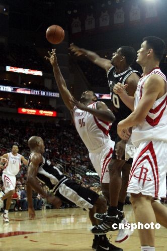 當(dāng)?shù)貢r(shí)間11月29日晚,火箭在主場(chǎng)以103-84大勝馬刺,成為西南區(qū)的領(lǐng)頭羊;鸺装l(fā)五虎得分都上雙,姚明打了27分鐘,拿下12分,但只搶1個(gè)籃板,蓋帽3次。中新社發(fā) 歐文 攝