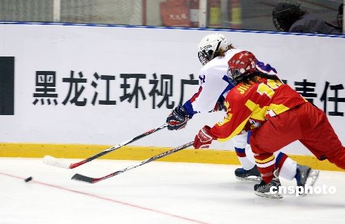 2月18日,第24屆國際大學(xué)生冬季運(yùn)動(dòng)會在哈爾濱冰球館拉開戰(zhàn)幕。當(dāng)日大冬會女子冰球比賽將在哈爾濱冰球館進(jìn)行3場比賽,首場斯洛伐克隊(duì)(白)對中國隊(duì)(紅),比賽進(jìn)行到10時(shí)20分中國隊(duì)進(jìn)首球。中新社發(fā) 姚庭山 攝