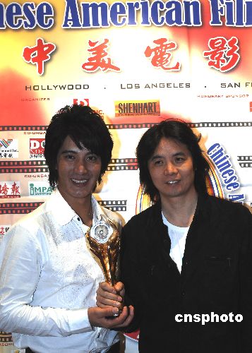 中國藏族演員蒲巴甲(左)在電影《喜瑪拉雅王子》里的出色表演,獲得中美電影節(jié)“金天使獎”,當(dāng)?shù)貢r間十一月七日晚他與導(dǎo)演胡雪樺趕到洛杉磯手捧獎杯與媒體見面,感慨自己從九寨溝走向了好萊塢。中新社發(fā) 賈國榮 攝