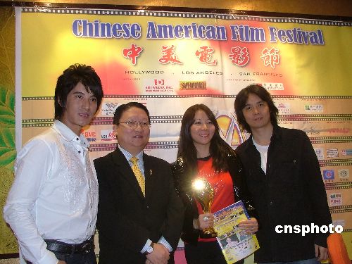 為期9天、在洛杉磯、舊金山兩地?zé)狒[登場(chǎng)的“中美電影節(jié)”接近尾聲。11月7日,中美電影節(jié)組委會(huì)主席蘇彥韜把“金天使”獎(jiǎng)杯頒給獲得十佳電影:《喜馬拉雅王子》(Prince of Himalayas)導(dǎo)演胡雪樺、制片人胡雪蓮、男主角蒲巴甲,并共同見證洛杉磯、舊金山兩地郵政管理局所發(fā)行的中美電影節(jié)開幕式紀(jì)念首日封。 中新社發(fā) 盧威 攝