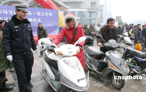 1月28日,連云港市公安局交巡警支隊(duì)和連云公安分局集中返還176輛被盜搶機(jī)動(dòng)車。去年以來,連云港警方嚴(yán)厲查處各類機(jī)動(dòng)車違法行為,加大盜搶車輛的犯罪行為的打擊力度。眾多失主在這批案值約100萬元的被盜搶車輛中,現(xiàn)場將自己被盜搶車輛領(lǐng)到了手中。中新社發(fā) 王健民 攝