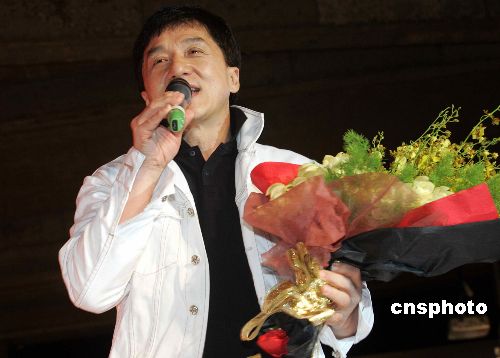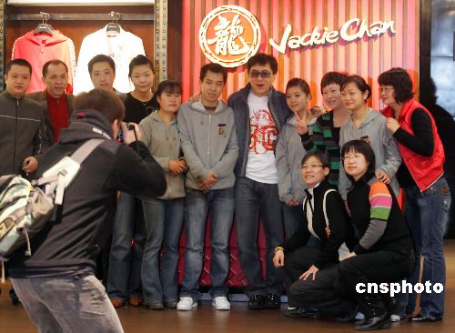 1月29日晚,二00八奧運(yùn)會(huì)形象大使、著名國(guó)際功夫巨星成龍來(lái)到昆明,出席在翠湖會(huì)舉行的“Jackie Chan杰克成08春夏新裝發(fā)布會(huì)”。中新社發(fā) 甘娜 攝