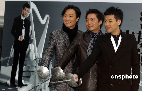 二月四日,香港歌星鄭中基(左)、梁漢文(右)與香港管弦樂團(tuán)(港樂)第一副團(tuán)長(zhǎng)梁建楓,手持寶劍以“三劍俠”姿態(tài)宣布,三方將首度合作于二零零八年在紅館舉行三場(chǎng)演唱會(huì)。中新社發(fā) 蔡蔓莉 攝