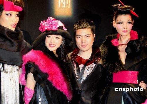 3月28日晚,以“寵愛”為主題的中國國際時(shí)裝周SEC2008秋冬高級(jí)成衣發(fā)布會(huì)在北京精彩登場(chǎng),給觀眾帶來一場(chǎng)震撼的視覺盛宴。圖為演員秦嵐(左二)與設(shè)計(jì)師祁剛(左三)亮相發(fā)布會(huì)。中新社發(fā) 趙雋 攝
