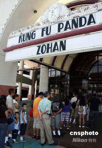 當(dāng)?shù)貢r(shí)間6月7日,由成龍和劉玉玲等好萊塢著名影星配音的動畫片《功夫熊貓》在美國洛杉磯各大影院上映。當(dāng)?shù)孛癖娕抨?duì)購票觀看新片。劉玉玲希望這部影片能借助2008北京奧運(yùn)的“中國熱”問鼎北美票房。 中新社發(fā) 金立冬 攝