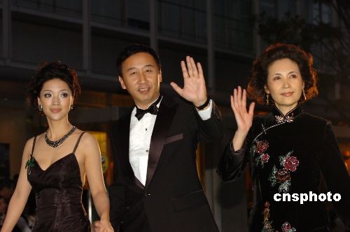 10月18日傍晚,第21屆東京國際電影節(jié)開幕。以“環(huán)!睘橹黝}的本屆電影節(jié)別出心裁地將星光大道的地毯由紅色改為綠色。上個月剛剛當(dāng)選日本首相的麻生太郎與開幕影片《赤壁》劇組成員同走綠地毯,成為第一個光臨東京國際電影節(jié)現(xiàn)場的日本總理大臣。圖為參加本屆電影節(jié)競賽單元角逐的中國著名導(dǎo)演馮小寧及電影《超強(qiáng)臺風(fēng)》主要演員。中新社發(fā) 朱沿華 攝