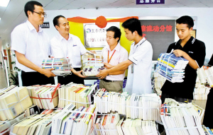 昨日上午,(深圳)寶安區(qū)圖書館富士康流動分館揭牌儀式在寶安區(qū)圖書館大堂內舉行,揭牌儀式現(xiàn)場堆放著1萬冊圖書,這些圖書都是準備送往富士康流動分館的觀瀾廠區(qū)。