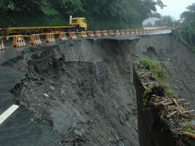 遭遇豪雨的蘇花公路遇雨則坍,南方澳到東澳間多處坍方。臺灣“災害應變中心”表示,一輛弘泰旅游公司載運大陸觀光客的游覽車在東澳受困,疑被落石擊中,大陸導游及司機困在變形車體內,深夜確定2人死亡,其他旅客無恙;另傳有一輛創(chuàng)意旅游公司的游覽車,搭載廣東團共19人失聯(lián)。