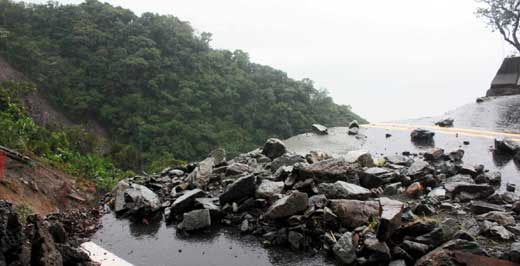 “鲇魚”帶來豪大雨沖毀蘇花公路,112至116公里處大面積坍方,多人受困,位在蘇花公路入口的東澳橋前晚就拉起警戒線,警告前方的路危機(jī)四伏。記者昨天上午7時(shí)從花蓮這頭118里處挺進(jìn)宜蘭,來回5個(gè)小時(shí)的直擊之旅,沿途碎石、斷木橫臥,山壁不時(shí)噴出猛泉,湍急而下,臺(tái)九線頓成滑水道,走在路面像溯溪。