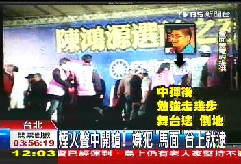 遭槍擊的連勝文,當(dāng)時(shí)還勉強(qiáng)地往舞臺(tái)邊走了幾步,突然蹦一聲,倒臥在地,開(kāi)槍的兇手林正偉,在面對(duì)舞臺(tái)的左邊,第一時(shí)間被警察跟民眾壓制在地。