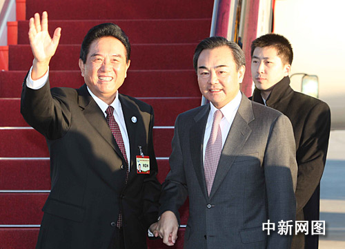 國臺辦主任王毅在機(jī)場為陳云林送行。中新社記者 趙振清 攝