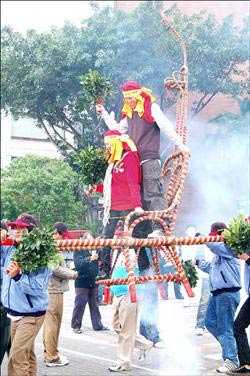 必須以肉身抵擋“炮火”的寒單爺向來是男性扮演,即使雙人轎也由兩位男性搭檔,“伍蔡戀”是情人上轎的頭一遭。負(fù)責(zé)扛轎炮炸的臺東市玄武堂特別小心謹(jǐn)慎,言明不朝情侶直接擲炮,但炮手還是技巧性地將鞭炮空拋到他們身邊,女的嚇得快腿軟,男的正好扮護花英雄。