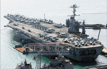 國際先驅導報特約撰稿海韜發(fā)自北京 “遲到”了近兩個月的美軍“華盛頓”號核動力航空母艦,9月25日終于緩緩駛入新母港日本橫須賀軍港。但僅僅6天之后,它就匆忙趕往韓國釜山,參加海上閱兵式;隨后,它還將南下東南亞,并于11月折回日本,主持美日海上聯合軍演。