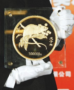 據(jù)臺灣《聯(lián)合報》報道,臺灣中華奧委會與北京奧運紀念金幣代理商臺灣大洋金銀幣27日舉行“二○○八北京奧運紀念金銀幣慈善拍賣會”,16組拍賣商品中,最受矚目的是重10公斤的“戊子鼠年紀念金幣”,金幣厚2.5公分、直徑18公分,拍賣底價為1220萬,最后以1225萬元賣出。