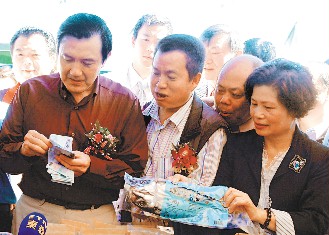 馬英九23日到宜蘭縣參加鯖魚節(jié)活動,當(dāng)場掏出一迭鈔票,數(shù)了兩萬元買魚松、鹽漬鯖魚等產(chǎn)品,希望民眾也多消費。圖片來源:臺灣《聯(lián)合報》