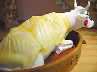 臺(tái)灣的奔牛節(jié)開(kāi)放創(chuàng)作現(xiàn)場(chǎng)(華山創(chuàng)意園區(qū)),最近每隔一段時(shí)間,現(xiàn)場(chǎng)就會(huì)換上一批花色不同的牛,有時(shí)還可看到正在創(chuàng)作的藝術(shù)家,如莊普現(xiàn)正創(chuàng)作“三只鹿”,讓牛披上了梅花鹿的皮,就有點(diǎn)“指牛為鹿”的味道。洪天宇的牛,內(nèi)臟器官全部外露。