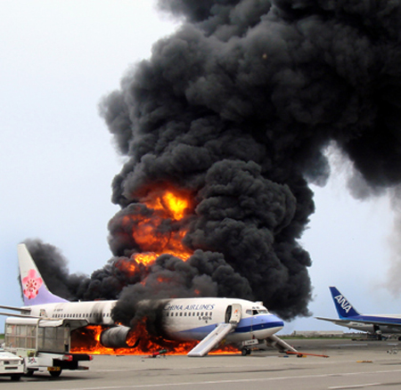 華航在日本琉球那霸機(jī)場發(fā)生火燒機(jī)意外!華航緊急疏散157個旅客,8個機(jī)組員也平安脫逃。圖為蔡湘雪旅客逃出時所拍的現(xiàn)場華航飛機(jī)爆炸畫面。記者周文郁/翻攝