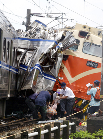 宜蘭大里6月15日發(fā)生火車撞火車重大事故,試運(yùn)列車攔腰撞上通勤電車,造成5死16傷,救難人員將車廂中罹難旅客搬出。記者曾吉松/攝影