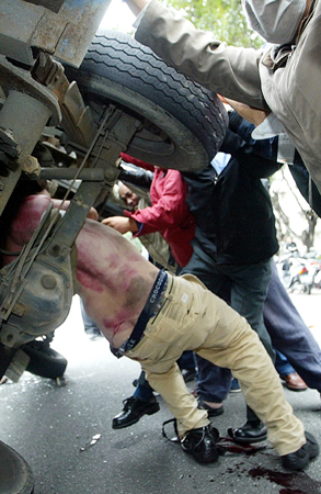 臺(tái)灣當(dāng)局強(qiáng)拆“大中至正”匾額爆發(fā)流血事件,民眾彭盛露涉嫌駕駛小貨車(chē)瘋狂加速撞上東森攝影記者王瑞璋,王送醫(yī)急救后傷勢(shì)漸穩(wěn)定,目前努力復(fù)建中。記者侯世駿/攝影