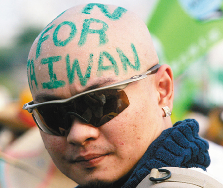 民進(jìn)黨宣傳“入聯(lián)”絞盡腦汁,小到郵戳,大到101大樓,都有UN FOR TAIWAN。圖為民進(jìn)黨高雄市“入聯(lián)”游行,一名綠營(yíng)支持者剃光頭寫(xiě)上英文。記者劉學(xué)圣/攝影