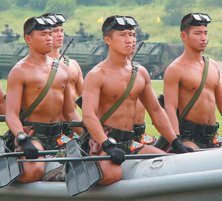 臺當(dāng)局舉辦“雙十節(jié)”典禮,安排了長達三十八分鐘的軍事表演。其中,兩棲蛙人部隊與特種部隊赤裸上身通過觀禮臺。記者鄭毅/攝影