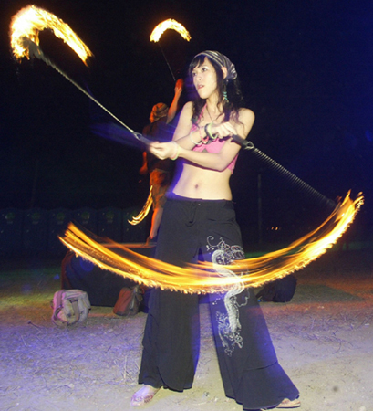 辣妹穿著清涼裝表演火球舞,讓人想靠近又不能太靠近。記者董俊志/攝影
