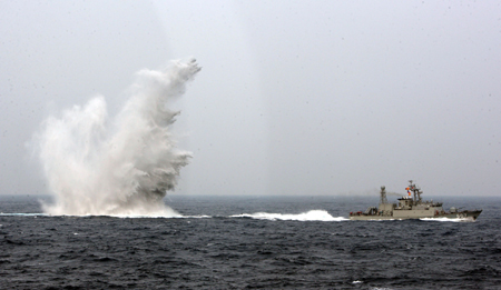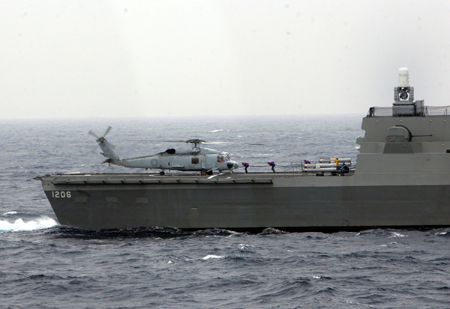 臺灣海軍今天在高雄左營基地舉行春節(jié)戒備操演,重點加強反潛艇演習(xí),動員了大小總共十六艘各式艦艇與反潛機,執(zhí)行包括反快艇作戰(zhàn)、緊急攻潛、?諈f(xié)同反潛及空中戰(zhàn)力整補,過程相當逼真!爸醒肷纭眻D 張皓安 攝