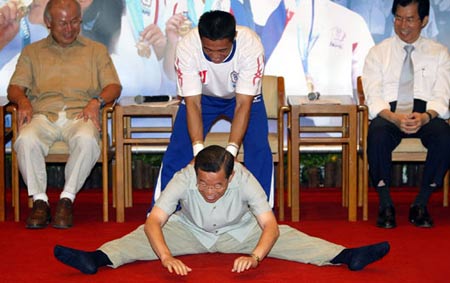 謝長(zhǎng)廷“漏網(wǎng)鏡頭”:臉涂迷彩 大玩倒立(組圖)(3)