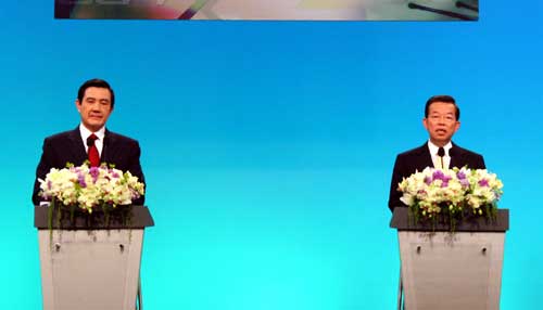晚間七時許,馬謝兩人一前一后抵達(dá)臺北公共電視臺。馬英九著深藍(lán)色西裝,系深紅色領(lǐng)帶;謝長廷著藍(lán)黑色西裝,系淺黃色領(lǐng)帶,兩人的太太今天均未陪同。