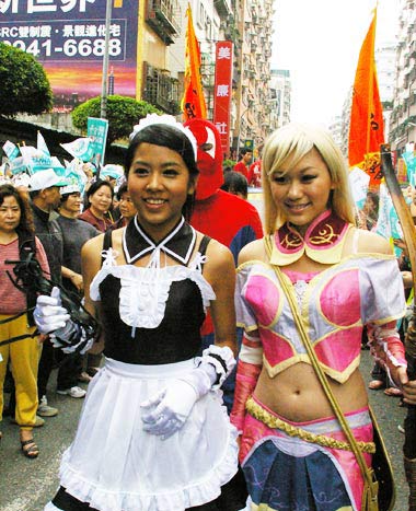 民進(jìn)黨游行隊(duì)伍中,有年輕辣妹打扮成女仆等裝扮,吸引路人眼光。