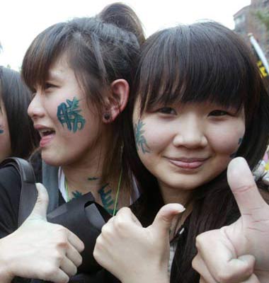 民進(jìn)黨活動(dòng)上參加活動(dòng)年輕人在臉上寫“勝”字挺謝長(zhǎng)廷。 聯(lián)合報(bào)圖