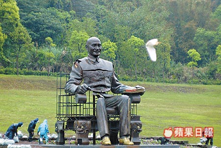 1年前在高雄市被拆除的蔣介石銅像,將較完整的117塊重組,放置慈湖紀念雕塑公園里,經(jīng)過拋光處理的鞋,象征走出新路。