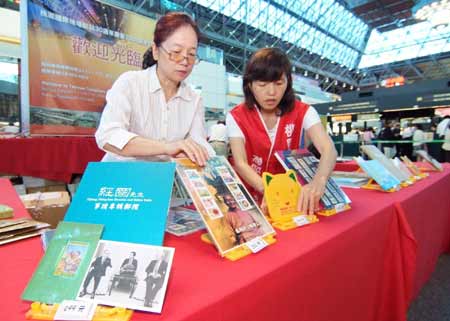 慶祝大陸觀光首發(fā)團(tuán)來臺(tái),臺(tái)灣郵政公司四日在桃園機(jī)場(chǎng)發(fā)行紀(jì)念郵票,票面包括馬英九、蔣經(jīng)國(guó)等人的肖像。