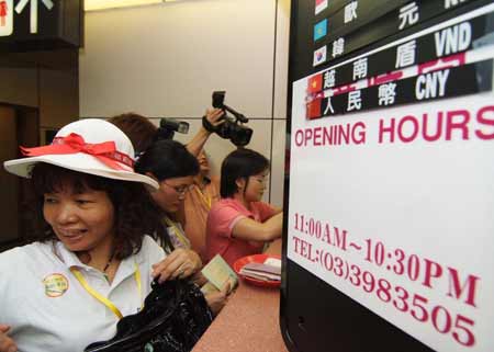 兩岸周末包機(jī)啟動(dòng),大陸赴臺(tái)觀光首發(fā)團(tuán)四日揭幕,第一團(tuán)從廣東出發(fā)的旅客在抵臺(tái)桃園機(jī)場(chǎng)時(shí),立刻兌換新臺(tái)幣。 “中央社”圖