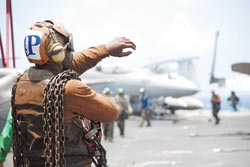 其中身穿黃色制服的是導(dǎo)引官和督導(dǎo)官,負責(zé)戰(zhàn)機彈射前的定位和引導(dǎo)工作,當(dāng)他蹲下用手擺出向前沖的手勢,就代表戰(zhàn)機可以彈射升空﹔白色制服人員則是安全組,負責(zé)甲板上人員警戒和安全醫(yī)療﹔穿著綠色制服的是彈射組,負責(zé)將戰(zhàn)機前輪固定在航母彈射器上,以及恢復(fù)攔截索定位。