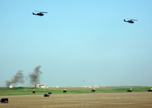 臺軍第五作戰(zhàn)區(qū)“漢光24號”演習,23日在臺中清泉崗空軍基地舉行空降暨反空降演練。圖為反空降掃蕩部隊在攻擊直升機火力支持下,防衛(wèi)軍發(fā)起沖鋒攻擊。(“中央社”圖)