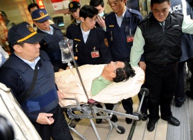 陳水扁禁食五天,16日晚間被戒護(hù)送往醫(yī)院治療,17日早上在警力戒護(hù)下轉(zhuǎn)院繼續(xù)治療。(“中央社”圖)