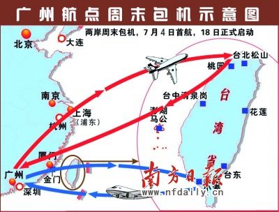 記者從國(guó)家民航局獲悉,后日首次周末包機(jī)共有18班包機(jī)往返兩岸,大陸航空公司分別由北京、上海(浦東)、廣州、廈門(mén)和南京5個(gè)首批開(kāi)放航點(diǎn)往返臺(tái)北桃園和松山兩個(gè)機(jī)場(chǎng),臺(tái)灣公司則由臺(tái)北、臺(tái)中、高雄、花蓮、澎湖5城市飛往北京、上海、廣州、廈門(mén)。