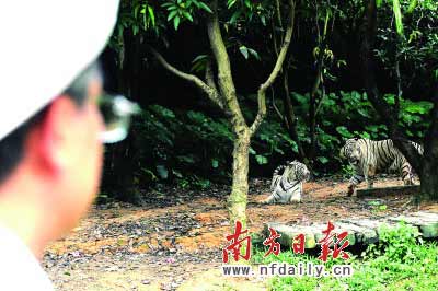 準(zhǔn)備送給高雄的兩只白虎為一公一母,公的叫“昭!,母的叫“歡樂”?吹娇腿藖砹,“昭!焙汀皻g樂”不時站起來走幾步,秀秀身材;又不時把臉朝向觀眾,配合鏡頭。訪問團(tuán)成員紛紛站到鏡頭前,與兩只白虎來個“遠(yuǎn)距離合照”。