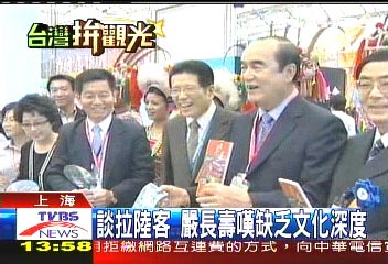 臺灣觀光協(xié)會要嚴長壽帶領(lǐng)金門連江宜蘭花蓮到上海,營銷臺灣旅游,面對先前北京喊出百萬人游臺,嚴長壽感嘆,光喊拉大陸客的口號不夠,臺灣拼觀光還是缺乏文化深度。