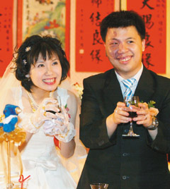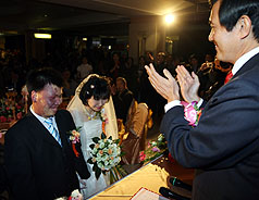 包括蕭萬長、郝龍斌等政界人士,11日也來現(xiàn)場“沾喜氣”。自稱是“專業(yè)證婚人”的馬英九,擔任證婚人。經(jīng)驗十足的他,證婚不忘宣揚政策,要求兩人一定要生足三個;因為只要是臺北市民生的第三個孩子,市政府將補助尿布錢。