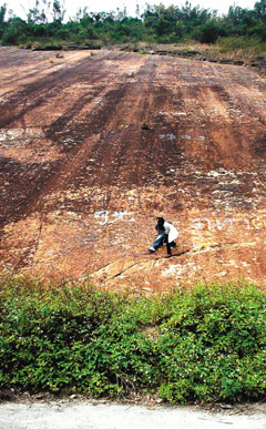 中新網(wǎng)12月18日電 南投縣中寮鄉(xiāng)“粗坑大峭壁”奇景,地質專家推斷年代是古老的第三紀地層,已有三千萬年歷史,最近成為暴紅旅游景點。許多游客競相攀登峭壁還噴字,留字表示“到此一游”。當?shù)鼐用窨匆娬滟F的地景遭到破壞相當心疼。