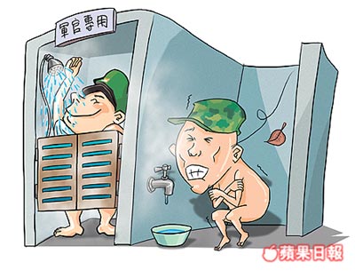 據(jù)臺灣《蘋果日報》報道,對此事,聯(lián)勤先以回應當局的節(jié)能減碳政策來開脫,但在進一步被問到為何軍官仍可洗熱水澡后,馬上又改口說,是因為士官兵的鍋爐壞了,所以才無法為阿兵哥提供熱水,但聯(lián)勤坦承:“軍官寢室沒有提供給阿兵哥使用,確有缺失!