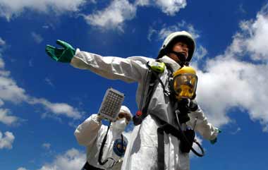 演習(xí)中舉行輻射彈爆炸處置,身著防護(hù)衣的臺軍部隊進(jìn)行輻射偵測