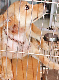 據(jù)臺(tái)灣TVBS報(bào)道,三只狗眼神無(wú)助,虛弱的躺在籠中,它們的脖子都有勒痕,深可見(jiàn)肉。其中一只狗被勒得頭部腫脹,另一只小時(shí)候就被人用塑料繩捆住脖子,長(zhǎng)大居然變成奪命繩。最嚴(yán)重的一只狗,脖子被橡皮筋割喉,脖子潰爛小命都快不保。
