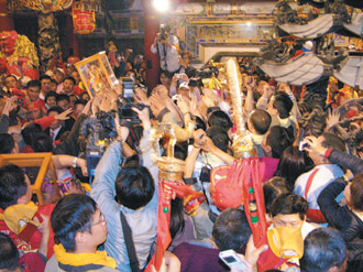 中新網(wǎng)3月26日電 據(jù)臺灣《聯(lián)合報》報道,大甲媽祖到新港繞境進香,25日上午在奉天宮前廣場舉行祝壽大典,數(shù)萬信眾跪地虔誠膜拜為媽祖賀壽,數(shù)百米馬路擠得水泄不通。晚間大甲媽回駕,信眾爭相觸摸媽祖金身,場面熱鬧滾滾。