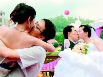 婚禮結(jié)束后舉辦趣味比賽,新郎抱起新娘親吻比久,原先取前三名,結(jié)果十多對(duì)都通過(guò)“考驗(yàn)”,通通有獎(jiǎng),他們說(shuō):“她不重,她是我老婆!”