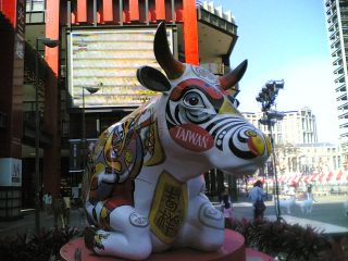 今年生肖牛年,搭配牛年,臺北市文化局協(xié)辦的“2009臺北奔牛節(jié)、奔牛入市、放養(yǎng) ”活動.由兩只牛拼奏成一頭奔跑的牛藝術(shù),另外全世界最大的牛,長、高四米六、兩米五,則現(xiàn)身在信義商圈,藝術(shù)家創(chuàng)作的主軸為平安牛,上頭畫滿臺灣傳統(tǒng)的民俗圖騰。國際文創(chuàng)執(zhí)行長陳秉鴻表示,臺北市是全世界第六十五個城市舉辦奔牛節(jié)活動,為了凸顯臺灣文化,臺北奔牛節(jié)充滿亞洲創(chuàng)意元素。