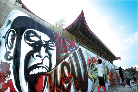 中新網(wǎng)10月22日電 據(jù)臺灣《中國時報(bào)》報(bào)道,昨日天氣晴朗,民眾紛紛外出走動,臺北“中正紀(jì)念堂”內(nèi)雖然有兩廳院屋宇修復(fù)工程,卻也舉行快樂涂鴉活動,邀請涂鴉高手在圍籬上一展身手,為修繕中的兩廳院增添了不同的面貌。